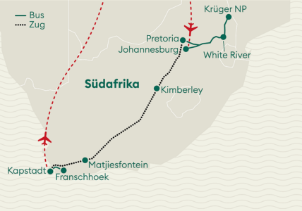 Direktflug mit SWISS ab Zürich nach Johannesburg. Rückflug mit Lufthansa via Frankfurt nach Zürich.