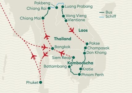 Thailand, das beliebte Rundreisen-Land im Südosten des Kontinents, ist für seine tropischen Strände bekannt, die nicht umsonst oftmals das Motiv von Postkarten sind. Neben den traumhaften Küstenabschnitten sind in Thailand auch eine ganze Bandbreite von atemberaubenden Tempeln, alten Ruinen und opulenten Königspalästen zu finden. Die Hauptstadt Bangkok verbindet Tradition und Moderne dabei so gut wie kaum eine andere Stadt der Welt.
