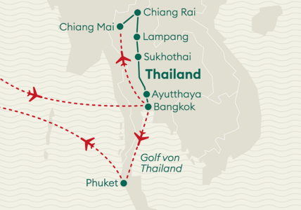 Das vor allem bei Sonnenanbetern geschätzte Reisedomizil mit seinen rund 500 Inseln ist ein scheinbarer Widerspruch aus dem Grossstadttrubel Bangkoks und einem idyllischen Leben an der Küste. Ein Besuch auf dem schwimmenden Markt offeriert die gesamte Vielfalt thailändischer Küche. Für Entspannung beim Beobachten des Treibens sorgt eine Klongfahrt, bevor der Königspalast samt Smaragd-Buddha-Tempel als weiteres Thailand-Highlight lockt. Bei einer Rundreise durch Thailand erkunden Sie naturbelassene, entlegene Winkel genauso wie die pulsierende Grossstadt Bangkok – mit optionaler Badeverlängerung. Besuchen Sie die Highlights und lassen Sie sich in deren Bann ziehen.