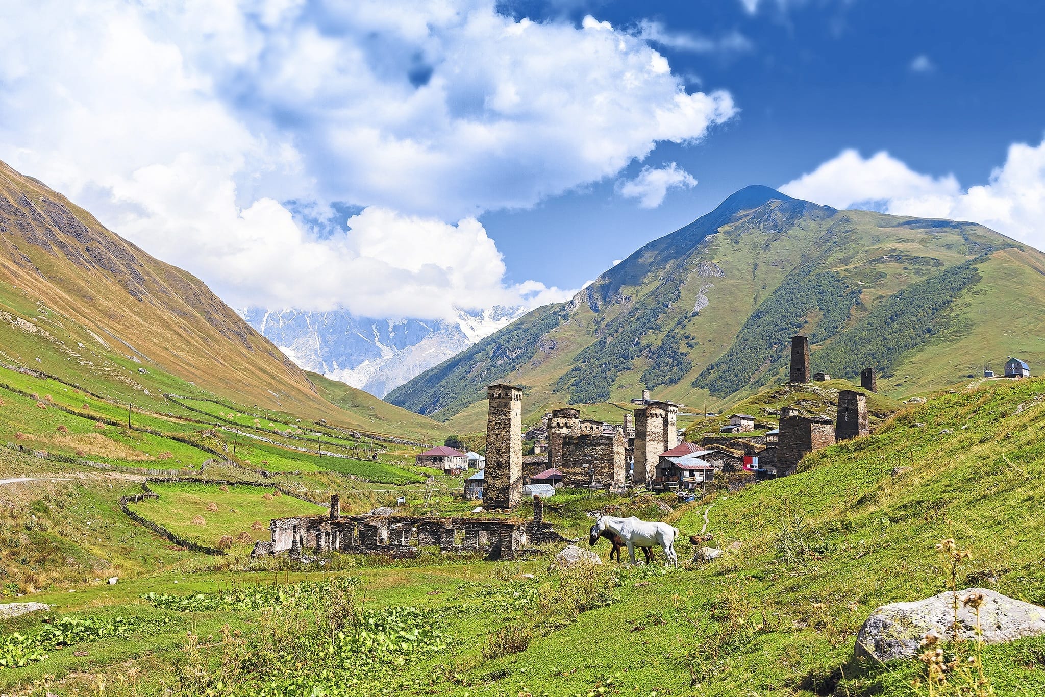 Heute wird es abenteuerlich. Sie fahren mit einem Geländewagen in eine der höchstgelegenen Ansiedlungen des Landes nach Ushguli. Ushguli besteht eigentlich aus vier kleinen Dörfern und bedeutet übersetzt «mutiges Herz». Etwa 80 Familien leben hier und brauchen vor allem im langen Winter Mut. Denn im Winter ist das Dorf oft tagelang von der übrigen Welt abgeschnitten. Durch die bekannten Wehrtürme, die bis zu 20 Meter hoch sind, zählt Ushguli heute zum UNESCO-Weltkulturerbe. Dank dieser ungewöhnlichen Architektur wird das Dorf auch oft als «mittelalterliches Manhattan» bezeichnet. Im Hintergrund ragt der Schara, der höchste Berg Georgiens, in den Himmel.