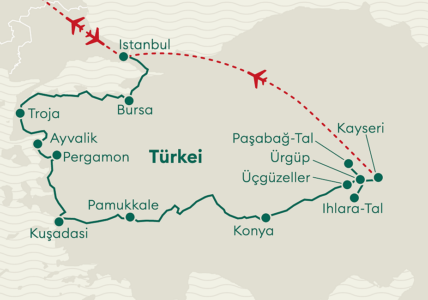 Entdecken Sie das reiche antike Kulturerbe der Westtürkei mit faszinierenden Ausgrabungsstätten Troja, Pergamon und Ephesus. Erleben Sie lebendige Städte, historische Bauwerke und die authentische türkische Kultur hautnah. Kappadokien entführt Sie mit seinen einzigartigen Tuffsteinformationen, unterirdischen Städten und jahrhundertealten Höhlenkirchen in eine märchenhafte Landschaft voller Geschichte und Naturwunder. Diese Reise verbindet Geschichte, Kultur und Natur zu einem unvergesslichen Erlebnis.
