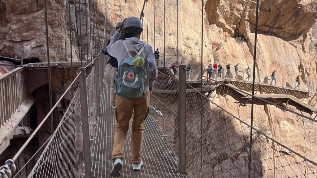 Endlich stand der Caminito del Rey auf dem Programm. Trotz der drohenden Regenwolken klarte es auf, als wir starteten. Der schwindelerregende, aber gut gesicherte Pfad führte uns durch die beeindruckende Schlucht und endete mit einer Hängebrücke, die im heftigen Wind wackelte, die Nerven nochmals testete und uns die Helme festhalten liess.