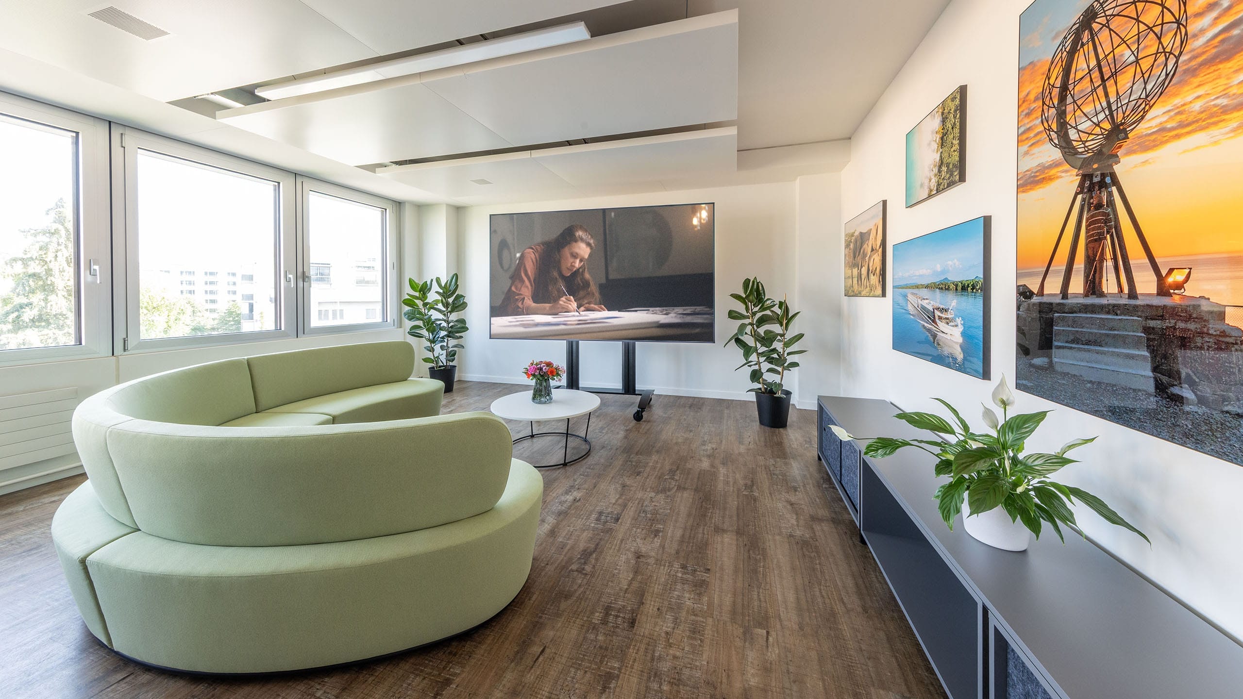 Machen Sie es sich auf dem Travel Lounge Sofa gemütlich und tauchen Sie auf unserem 110-Zoll-Bildschirm multimedial in die Reisewelten der Twerenbold Reisen Gruppe ein.